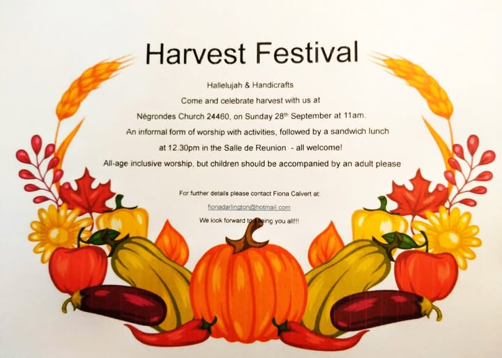 - Sunday 28th Sept, 11:00 Négrondes, Hallelujah & Handicraft Harvest Festival, Rev’d Helen Savage, Alexandra Billing, Patrick Sturges
