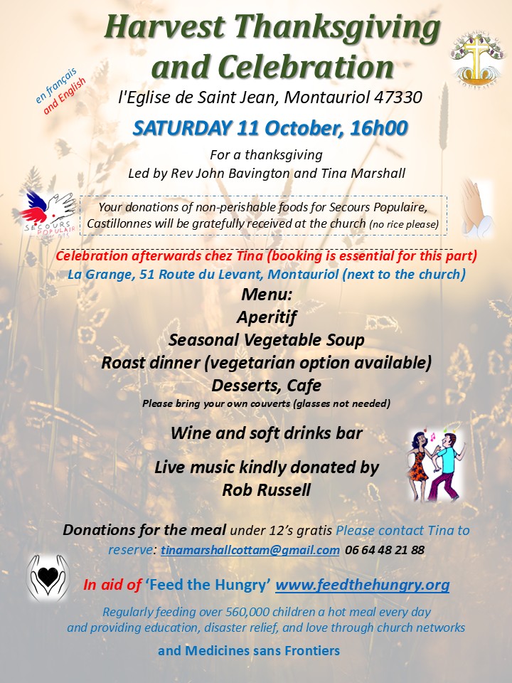 - Saturday 11th Oct – Montauriol (47330), 16:00 Harvest Celebration, Rev’d John Bavington & Tina Marshall